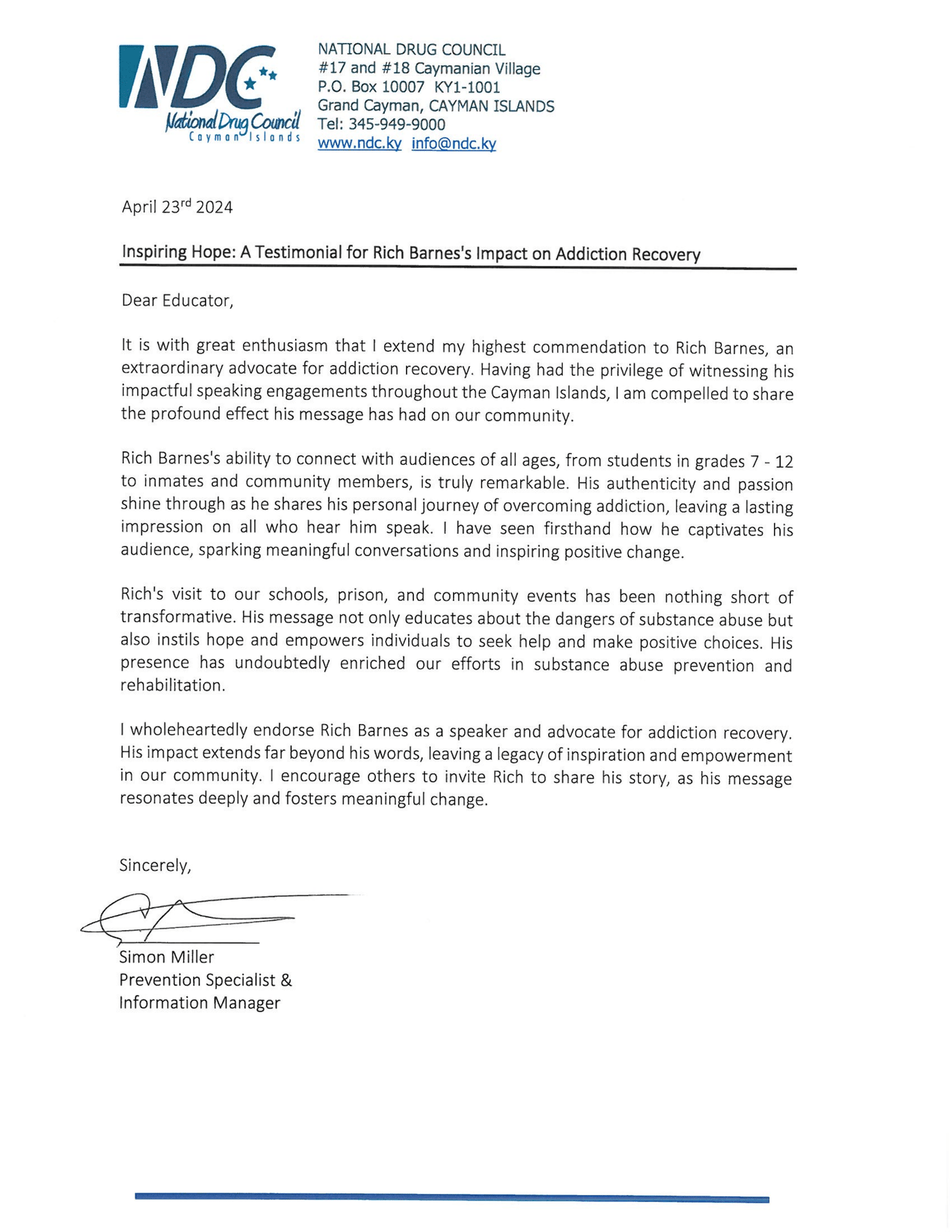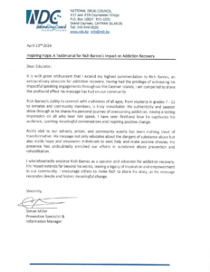 It is with great enthusiasm that I extend my highest commendation to Rich Barnes, an extraordinary advocate for addiction recovery. Having had the privilege of witnessing his impactful speaking engagements throughout the Cayman Islands, I am compelled to share the profound effect his message has had on our community