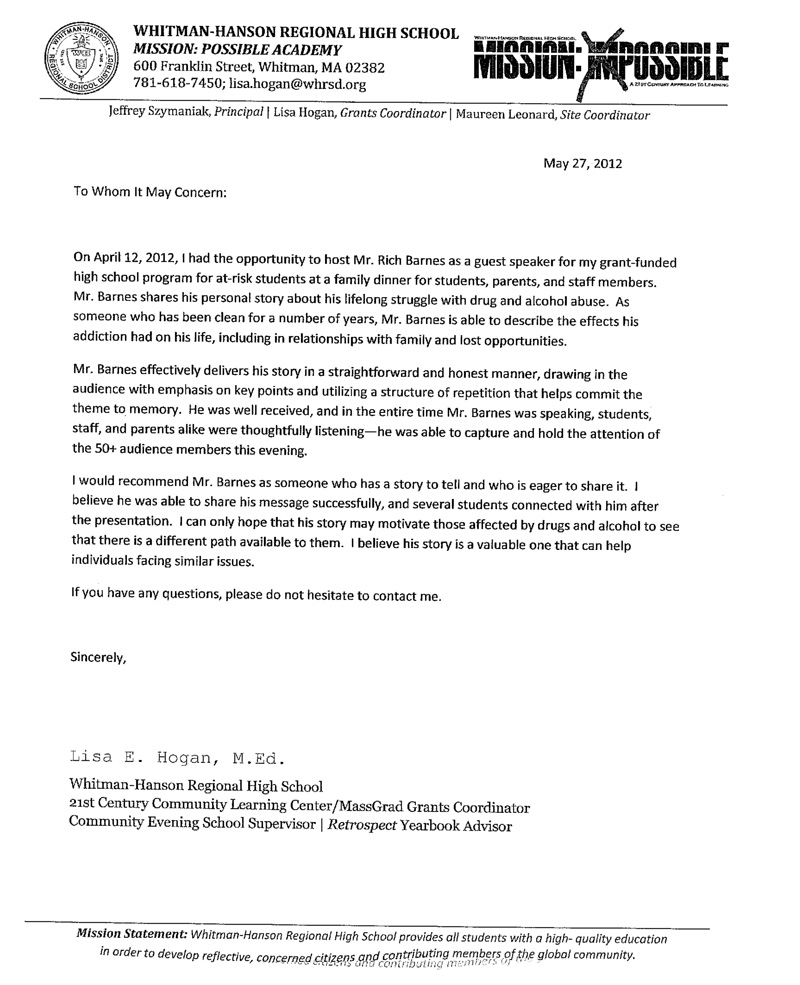 On April 12, 2012, I had the opportunity to host Mr. Rich Barnes as a guest speaker for my grant-funded high school program for at-risk students as a family dinner for students, parents, and staff members. Mr. Barnes shares his personal story about his lifelong struggle with drug and alcohol abuse. As someone who has been clean for a number of years, Mr. Barnes is able to describe the effects his addiction had on his life, including in relationships with family and lost opportunities.