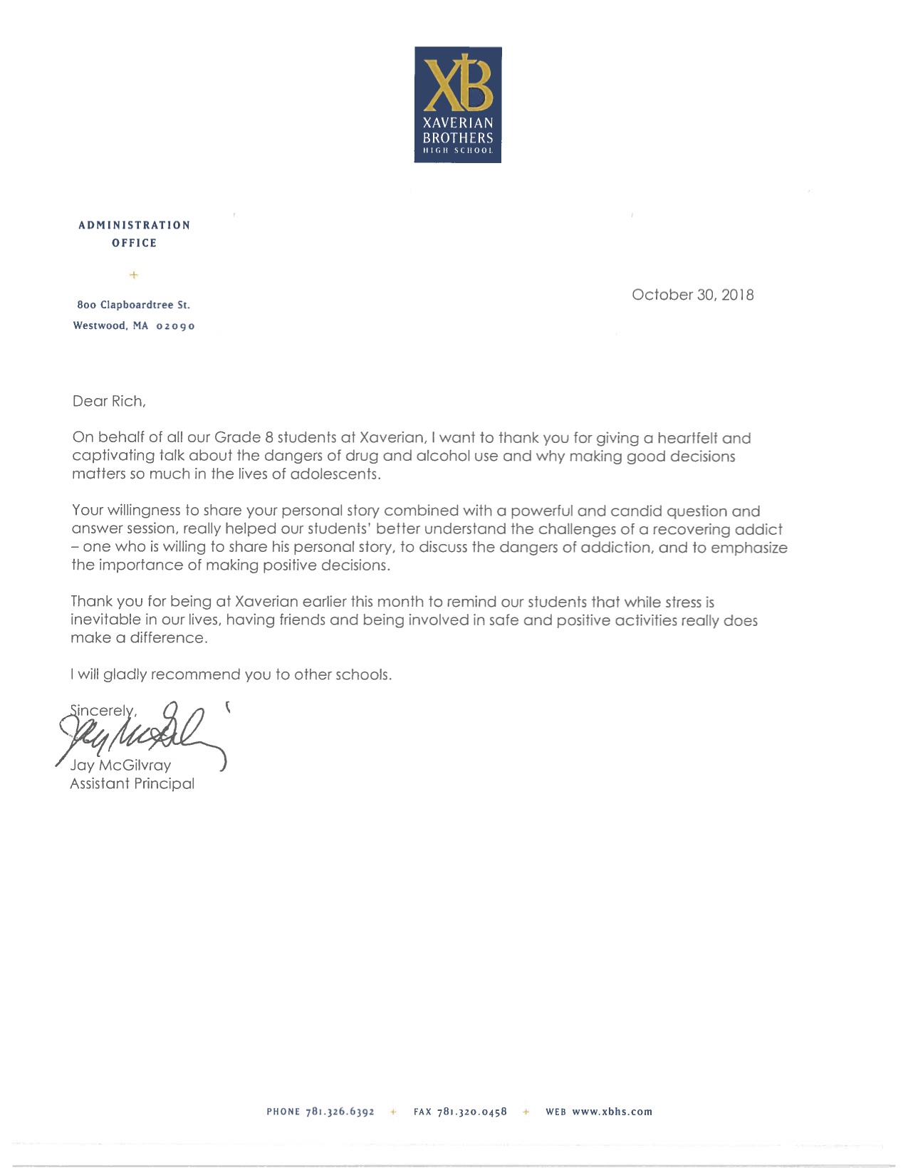 On behalf of our grade 8 students at Xaverian, I want to thank you for giving a heartfelt and captivating talk talk about the dangers of drug and alcohol use and why making good decisions matter so much in the lives of adolescents.